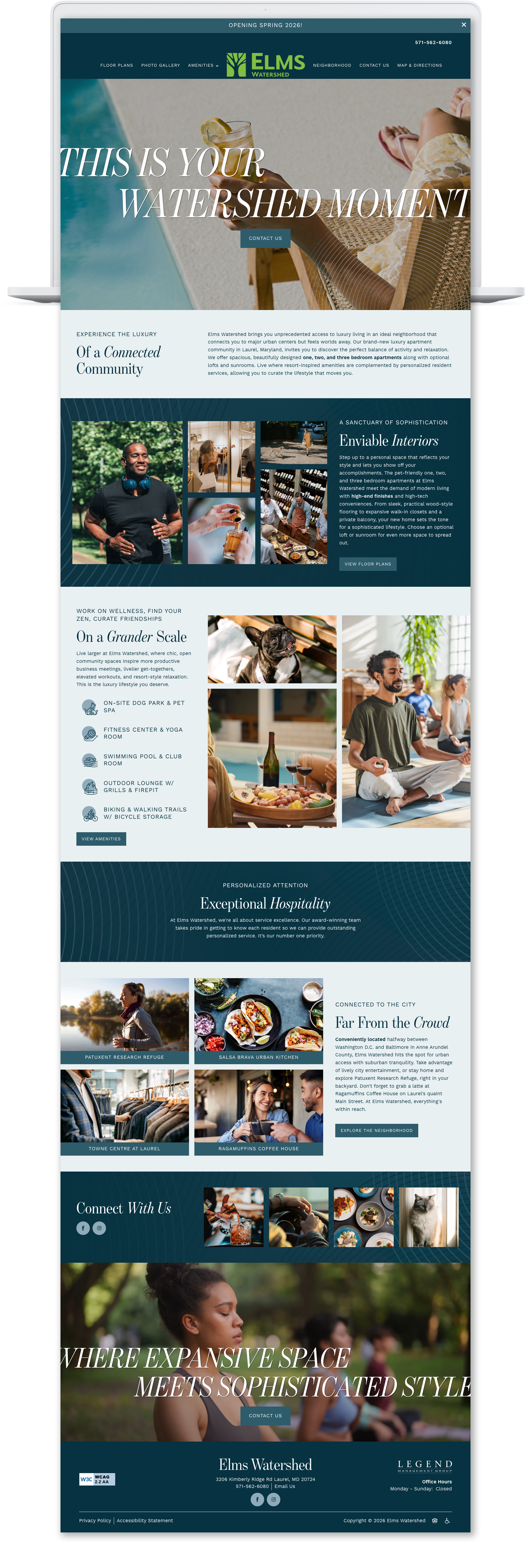 Elms Watershed brings together an atmosphere of socialization and relaxation. An idyllic retreat from the demands of work and the energy of everyday life. Visually, the brand balances tranquility and contemporary living through the interplay of open space, elegant serif typography, and structured layouts complimented with bold color and layered elements. The scope of the work extended across social media, web design, stationery, and marketing collateral.